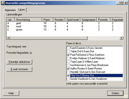 In het tweede tabblad kunt u zien welke lijnen er zijn en hoe de paren ingedeeld zijn. Ook kunt u hier opgeven of voor een paar standaard een persoonlijk overzicht afgedrukt dient te worden. Plaats een vinkje voor een paar indien dat het geval is.